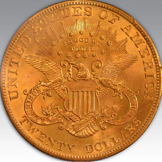 The Double Eagle is a powerful symbol of wealth and American history, struck between 1849 and 1933. These $20 gold coins feature the iconic image of Lady Liberty on the obverse, radiantly portrayed alongside the majestic eagle on the reverse. Known for their intricate design and craftsmanship, Double Eagles are among the most sought-after coins by collectors and investors alike.